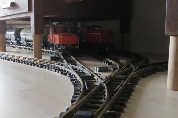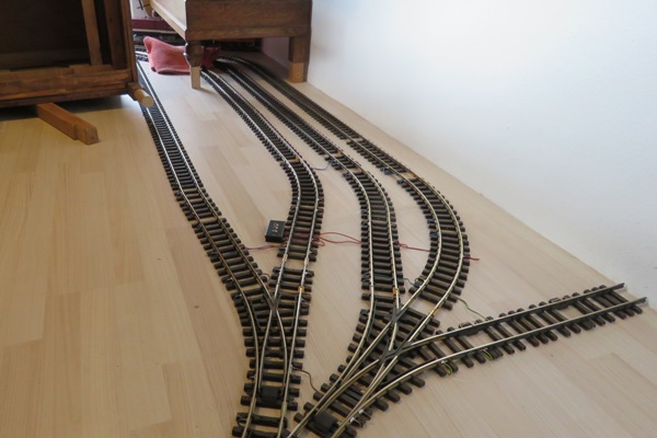 Und auch im Eisenbahnzimmer hat sich etwas großes getan: der Schattenbahnhof wurde erweitert. Mein Eisenbahnfreund Udo erwähnte die Möglichkeit ein Möbelstück auf Stelzen zu stellen, damit untendrunter die Durchfahrt für die Eisenbahn ermöglicht würde. Und das habe ich genau so gemacht: sowohl den Arbeits-/Schreibtisch als auch den alten Kleiderschrank, in dem ich meine Bastelsachen lagere, erhielten an den Beinen zusätzliche Füße, sodass die selbe Durchfahrtshöhe erreicht wurde wir beim Fenster nach draußen. Natürlich stehen die Schrankbeine immer noch an derselben Stelle, aber es konnten drei weitere Abstellgleise geschaffen werden. Und die ungeliebte Dreiwegweiche fand nun einen Platz; auf einem kurzes Stumpfgleis kann zusätzlich ein Triebwagen abgestellt werden. Nun können nicht nur sechs sondern sogar neun Züge für die sofortige Ausfahrt bereit stehen; mehr als es sinnvoll ist, auf der Anlage fahren zu lassen. Aber so kann zukünftig häufiger variiert und abgewechselt werden. Und darüber hinaus stehen nun auch fast alle meine Gartenbahnfahrzeuge im direkten Zugriff; nur noch wenig steckt in einer Schachtel. |