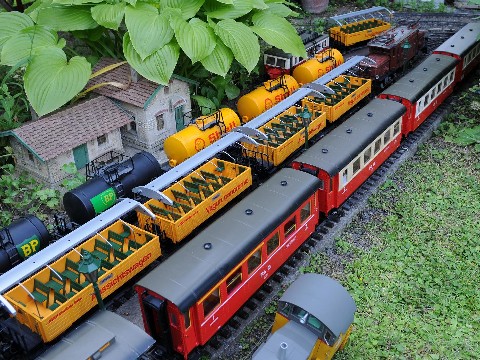 Zusätzlich wollte das LocoLink-System, welches Roy zur Steuerung nutzt, nicht so recht funktionieren. Die Lokomotive fuhr nur dann, wenn die Antenne des Senders nahezu das Gehäuse der betreffenden Lok berührte. So war ein Betrieb nicht möglich. Ein Verdacht von mir ist, dass Roys LocoLink durch mein Funksystem der ESU-mobil-controll gestört wurde. Vielleicht sollten wir nochmals einen Test machen, wenn ich die mobil-control ausgeschaltet habe. Ebenso könnte das Funksystem durch unser oder des Nachbarn WLAN gestört sein. Das müsste mal richtig ausgetestet werden. Hinweise hierzu habe ich in einem Forum gelesen. Fahrzeuge standen mehr als ausreichend zur Verfügung, hatte doch ich bereits schon mehr rollendes Material bereitgestellt, als die Strecke verkraftet (man möchte schließlich etwas Auswahl haben) Alexander und Roy brachten weitere Modelle mit, sodass sich das eine oder andere ergänzte. So kam es zu einem kleinen RhB-Krokodiltreffen mit vier Fahrzeugen, ohne dass alle identisch waren, obwohl streng genommen, die brauen Krokos alle unter der selben Bestellnummer 2040 bzw. 20400 katalogisiert waren. Lediglich das Grüne hat eine eigene Nummer. Ergänzt haben sich auch die Cabriowagen. Roy hatte einen ganzen Zug mit, einen weiteren Wagen dieser Art konnte ich beistellen. |