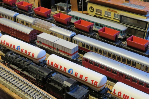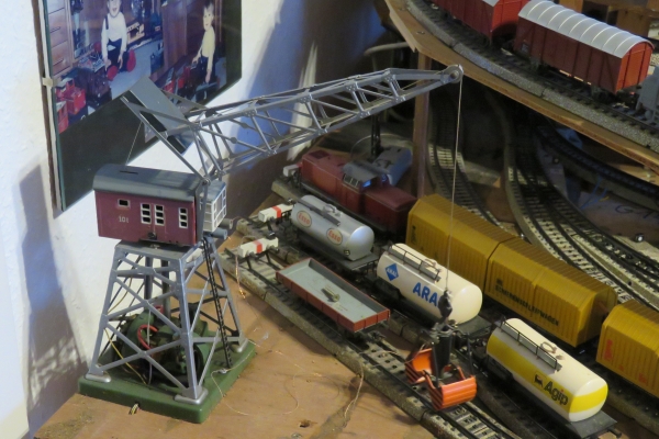 Mit meiner alten Märklin H0-Anlage spiele ich nicht so oft. Im Winter oder bei schlechtem Wetter noch eher als im Sommer an schönen Tagen, da spiele ich lieber draußen mit der Gartenbahn oder gehe gar irgendwo auf einen 5-Zoll-Fahrtag. Und doch möchte ich nicht auf das Fahren mit meinen alten Märklinsachen verzichten. Und daher wird immer wieder der Strom eingeschaltet und ein paar Runden auf der Anlage gefahren. Meist mit den Zügen, die gerade auf den Bahnhofsgleisen stehen, ein Zugwechsel mit dem Schattenbahnhof ist derzeit eher schwierig. |