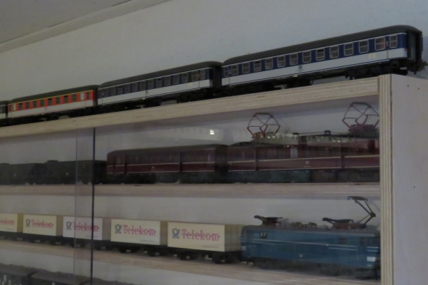 Ganz generell habe ich das Problem, dass ich einfach zu viele Züge auf der Anlage habe (schließlich fielen beim Umbau sieben Abstellgleise im Schattenbahnhof weg). Alle Durchgangsgleise sind besetzt und es ist sehr schwierig, einen neuen Zug aus dem Schattenbahnhof heraus zu holen und fahren zu lassen. Irgendwie muss ich dafür sorgen, dass zumindest ein Durchgangsgleis (somit eine Strecke) dauerhaft frei bleibt um für einen Zugwechsel mit dem Schattenbahnhof flexibel zu bleiben. Da muss mindestens ein Zug von der Anlage runter und woanders „geparkt“ werden; vielleicht „auf“ der Vitrine, denn „in“ der Vitrine ist auch kein Platz mehr… . |